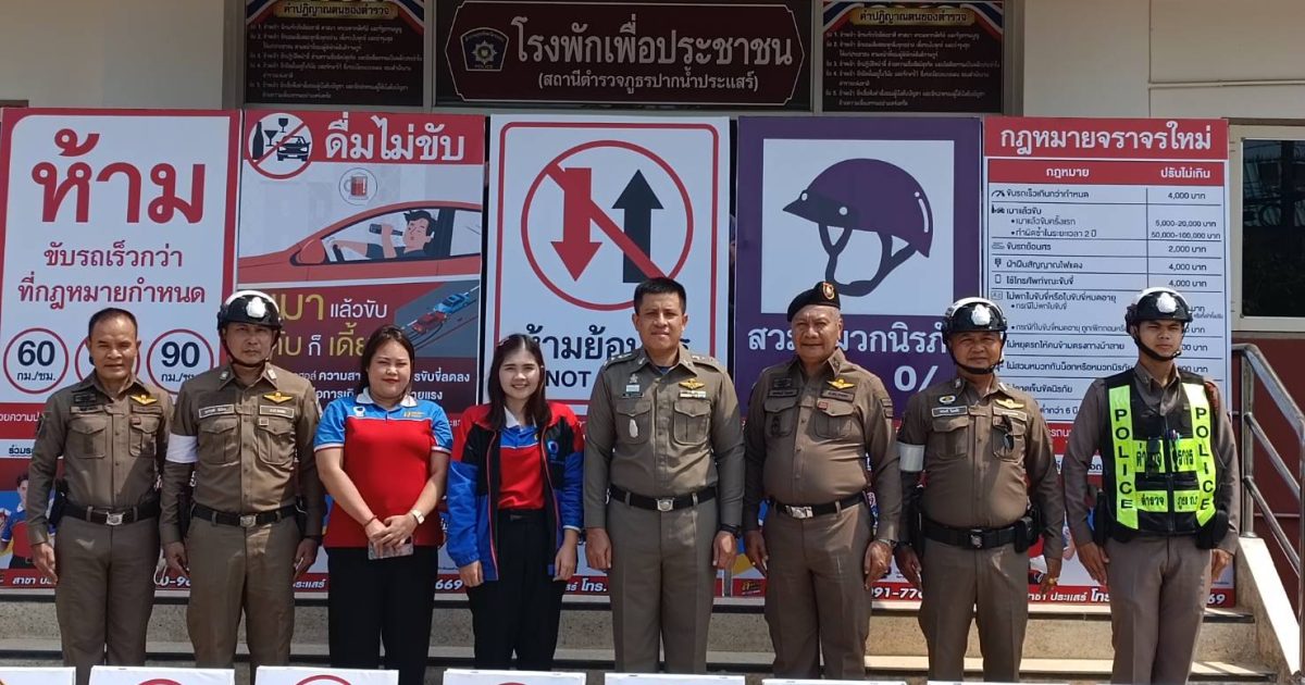 พ.ต.ท.สายัณห์ วันแรก รอง ผกก.ป.สภ.ปากน้ำประแสร์ พร้อมกำลังสายตรวจจราจร สภ.ปากน้ำประแสร์ รับมอบป้ายประชาสัมพันธ์วินัยจราจร จาก บริษัทสมหวัง เงินสั่งได้ สาขา ปากน้ำประแสร์